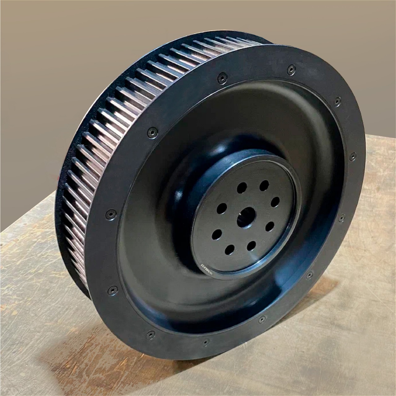 Шкив № 2 - Synchrochain 14M 80S, B=79мм, 8 отверстий d=12,5мм. Шкив с фланцевым креплением — 8 равномерно расположенных отверстий под болтовое соединение. Конфигурация точно воспроизводит оригинальное исполнение для сопряжения с ответными деталями узла.
