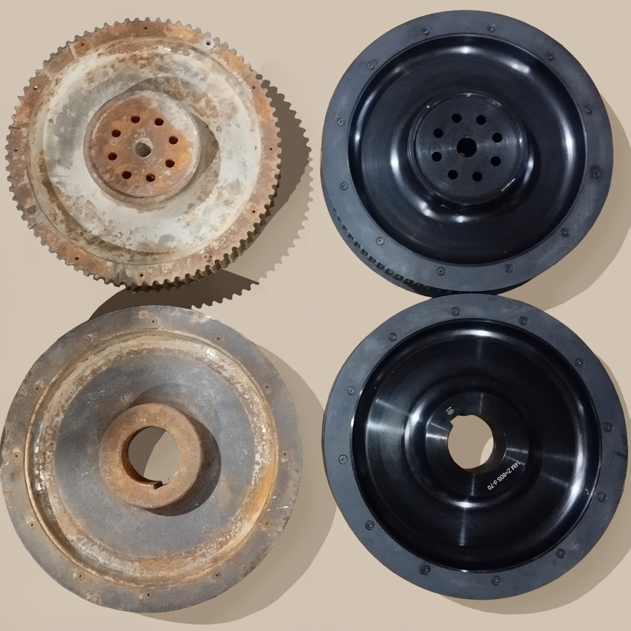 Обмер и восстановление геометрии. Специалисты самостоятельно сняли все необходимые размеры с оригинальных шкивов: наружный диаметр, делительный диаметр, шаг и профиль зуба, ширину венца, посадочные диаметры и параметры крепёжных элементов. Задача осложнялась степенью износа: часть размеров требовала восстановления расчётным путём на основе стандарта 14M.