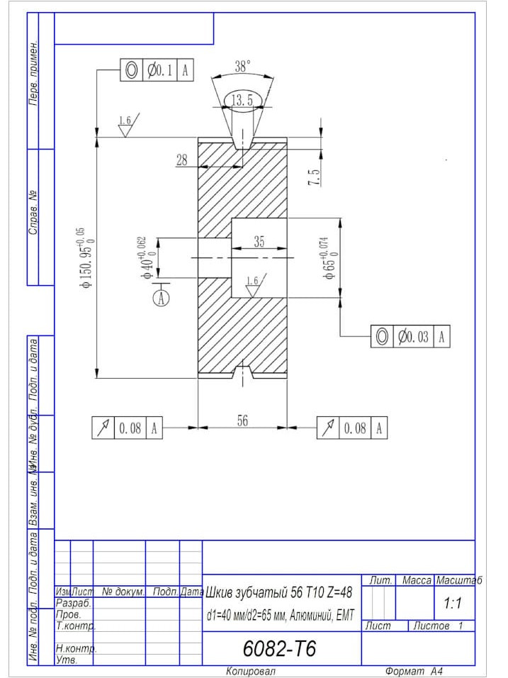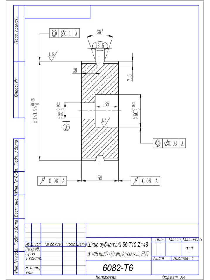 Наши специалисты создали чертежи и выполнили работы по изготовлению из алюминия зубчатых шкивов 56 T10 Z=48 d1=25 мм/d2=50 мм и 56 T10 Z=48 d1=40 мм/d2=65 мм.