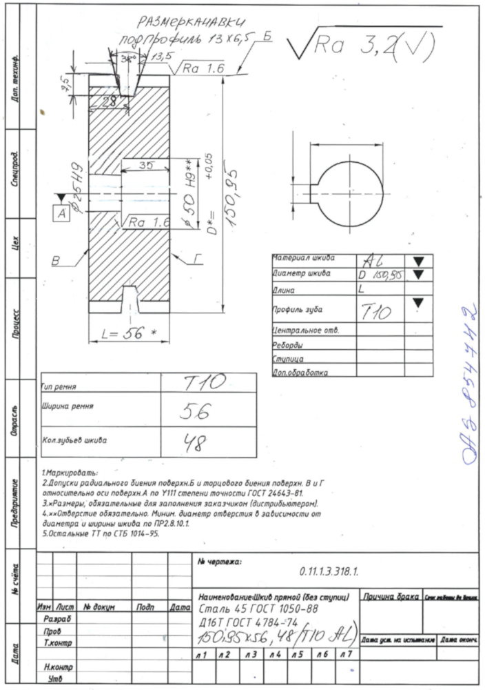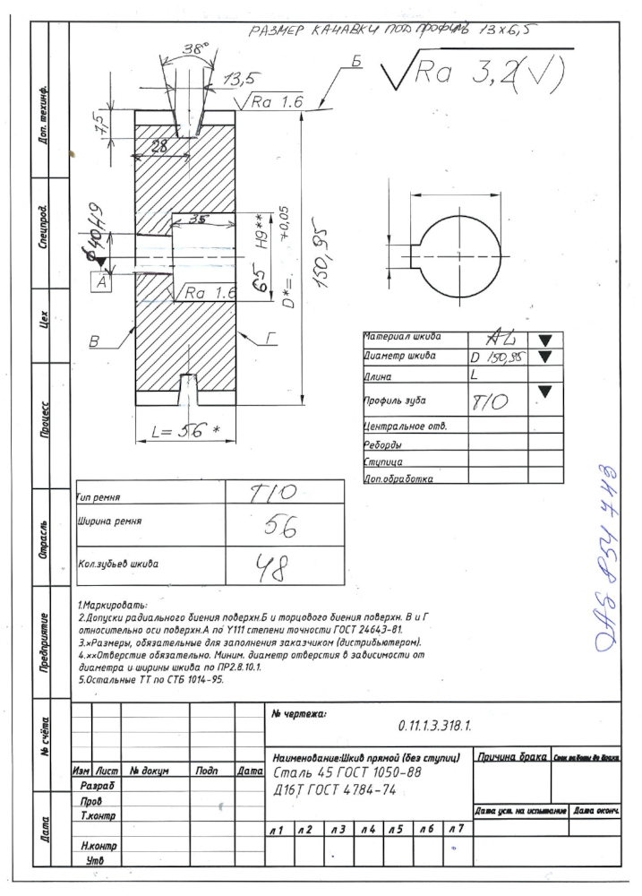 Эксклюзивная поставка зубчатых шкивов Т10 в нестандартном исполнении с проточкой под К13 профиль ремня по эскизам заказчика.