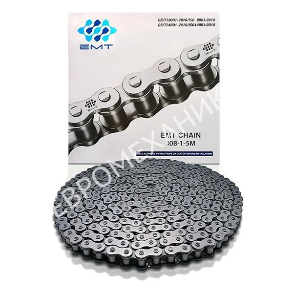 Цепь роликовая 10B-1 (ПР-15,875-23), EMT, однорядная, европейского стандарта (DIN 8187 – ISO 606), с шагом цепи 15,875 мм, изготовлена из высокопрочной закаленной стали. Имеет ширину ролика 9,65 мм, диаметр ролика 10,16 мм. Цепь поставляется в упаковке отрезками по 5 м.Характеристики