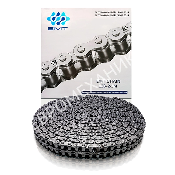 Цепь роликовая 12B-2, EMT, двухрядная, европейского стандарта (DIN 8187 – ISO 606), с шагом цепи 19,05 мм, изготовлена из высокопрочной закаленной стали. Имеет ширину ролика 11,68 мм, диаметр ролика 12,07 мм. Цепь поставляется в упаковке отрезками по 5 м.Характеристики
