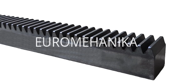 Рейка зубчатая М2, 20х20 мм, L=2000мм с закалкой зубьев - HRc 40-45, угол наклона зубьев 20°, число зубьев 319, российского бренда "EMT", изготовлена из углеродистой стали С45, подвержена закалке для повышенной твёрдости, износостойкости и прочности характеристик поверхности зубчатой передачи. Планка с зубьями является одной из деталей реечной передачи, которая используется в механике для преобразования вращательного движения в непрерывное линейное движение или наоборот. Рейки производятся отрезками L=500, 1000, 2000, 3000мм и соответствуют ГОСТ.Характеристики